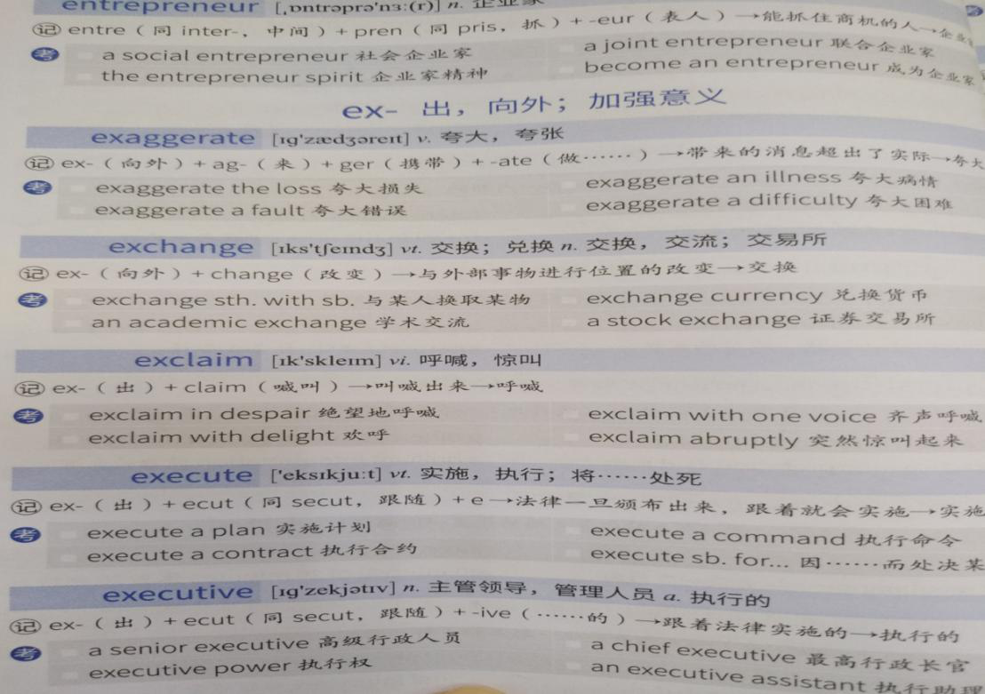 比如“ex-”这个前缀,表示的是“出、向外”的意思。那么,exchange这个词,就是 由前缀“ex-”加上“change(改变)”构成的。简单来理解一下,就是“与外部事物进行位置的改变”,也就是“交换”了。这样背起单词来,是不是更加地省时省力,而且不容易遗忘呢。