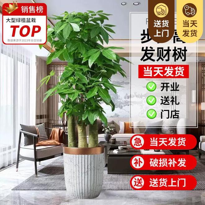 这款三杆发财树,高达1.6-1.8米,树形饱满,枝叶繁茂,绿意盎然,堪称室内绿植的典范。它不仅寓意吉祥,象征财源广进,更易于养护,适合放置于客厅、办公室等空间,为您的环境增添一抹生机与活力,是开业乔迁的理想之选。