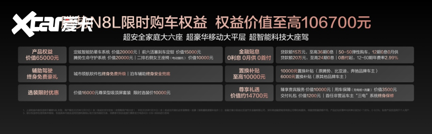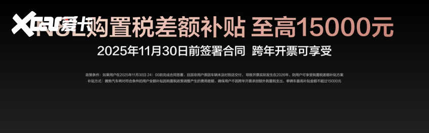 为回馈广大用户的支持,腾势N8L同步推出限时购车权益,权益价值至高10.67万元!包括价值1.7万元的三年免息,最高1万元的置换补贴。此外,不必担心因为交车晚,享受不到购置税补贴:在2025年11月30日24点前完成合同签署的用户,如果因非用户原因车辆未及时交付,导致开票实际发生在2026年,可享受购置税差额补贴,最高1.5万元!